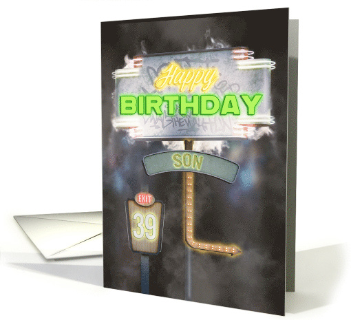 Give your son a retro themed 39th birthday greeting with this design featuring a pair of vintage looking neon road signs at night surrounded by a smoke effect.