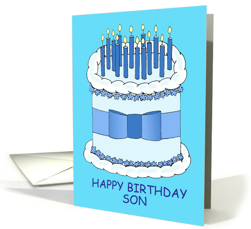 A large white birthday cake, decorated with blue candles, a bow and icing, stands against a sky blue background. The card says 'Happy Birthday Son' on the front.