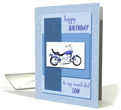 A blue motor cycle on an abstract blue background. The front says "Happy Birthday to my wonderful son". A great card for a son who is a motor bike enthusiast. The textures on the fron of this card are printed.