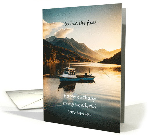 A birthday card for a son-in-law. A unique fishing birthday card with a mountain lake scene, designed for men who love fishing, boating, and the great outdoors. Celebrate his special day with a fishing birthday card featuring a man fishing from a boat on a mountain lake. A perfect birthday card for outdoors men, dads, husbands, and fishing lovers—ideal for anyone who enjoys the great outdoors.