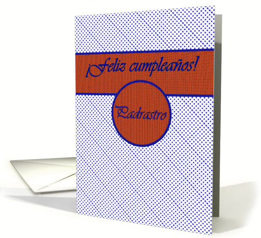 This card has an orange tiled stripe and a circle with a blue line accent on a blue polka dot background and the Spanish expression: "¡Feliz cumpleaños! Padrastro”
