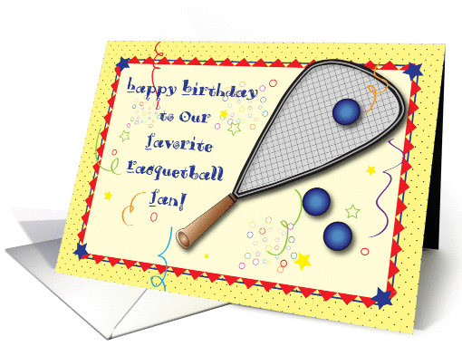 This is a birthday card for a racquetball fan, featuring a racquet, balls, and confetti. You can change the inside message at checkout, if you wish. 101011
