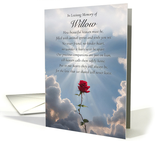 A single red rose, the symbol of love, reaching to the heavens. This pet sympathy card may be used for any animal. You make it personalized with the beloved pet's name. Dog, cat, horse, rabbit, rat, turtle or fish, or one that I didn't mention this card will work, and it makes it more of a custom memorial card. Our pets are far more than pets, they are our teachers, friends and family. They contribute so much to our lives. Heaven must be very beautiful if it is filled with these amazing souls.
