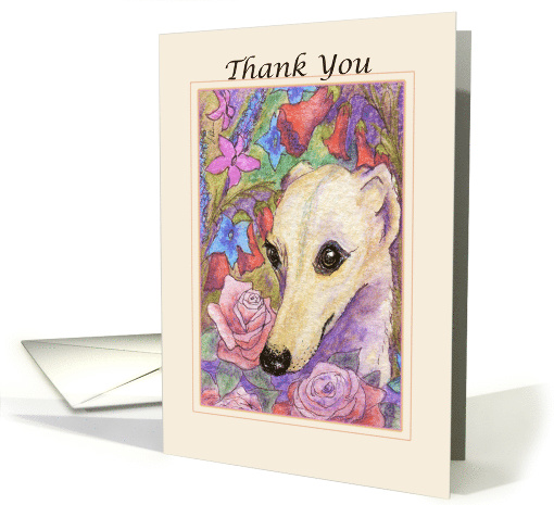 Whippet Dog amongst Flowers on Cream background saying Thank You