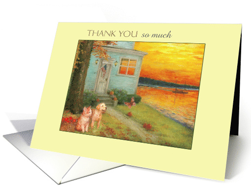 colorful thank you greeting with bucolic coastal nocturne, glorious Fall foliage watercolor with adorable pets infront of lakehouse , original sunset cottage on water's edge by judith cheng