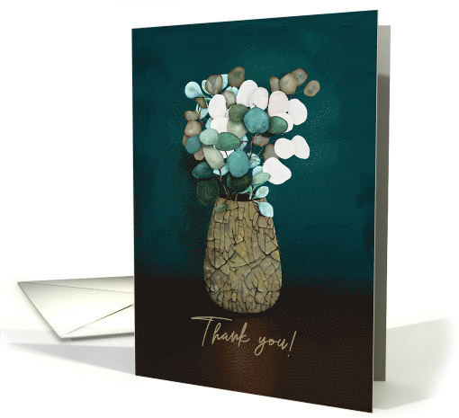 An interesting botanical, the Lunaria or 'silver dollar' flower, some call the money plant as well, creates an aesthetically pleasing arrangement in a crackled and chipped vase. Digital painting with realistic textured look in dark aqua and dark brown. A lovely THANK YOU greeting card for any occasion.