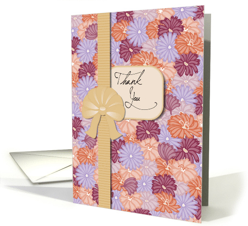 Illustrated Thank You card for anyone. Stacked flowers in a color palette of lightly yellow colored, mauve, lilac, and apricot. This is a representation or stylization of a flat wrapped gift. A golden ribbon with grosgrain texture sits below a shell shaped bow. A yellow ivory tag says Thank You in calligraphy. Inside card reads: A golden thank you. The card gives the impression of a layered scrapbook card but is a digital reproduction that prints flat