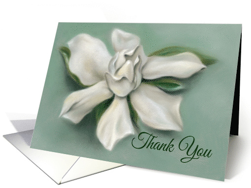 This general thank you card is appropriate for expressing gratitude in a number of situations. The design is embellished with a lovely gardenia blossom rendered in hues of pastel green and white along with elegant script in dark green.