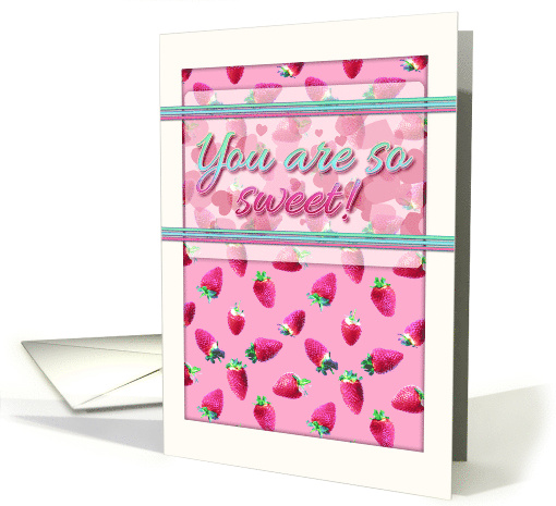 A cute thank you card decorated with bright magenta strawberries arranged like a polka dot pattern on a pink background, with neon / lime green & teal leaves. Pretty cursive text on a translucent banner with a gradient overlay reads: You are so sweet! Inside verse reads: Thank you for everything! Perfect to show appreciation and send thanks to a special someone!