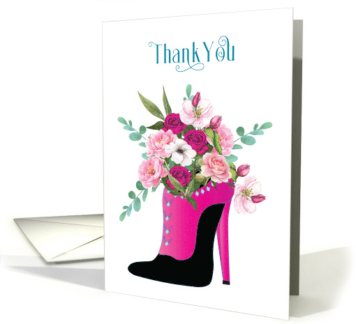 Beautiful thank you for a greeting with a stylish and fashionable high heel shoe in fuchsia and black holding a bouquet of flowers making this one ideal to express your appreciation.
