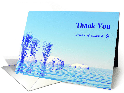 A card to send your thanks for the help. A lovely card that gives a tranquil feeling. A picture of reeds and stones and blue water. A lovely spa that invites you to dive in and relax.