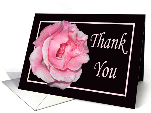 This card depicts a single pink double rose with dewdrops, There is a frame of black and a thin white mount, with black background in the middle on which is written "Thank you",in pale pink. Photograph and Artwork by Mary Taylor.
