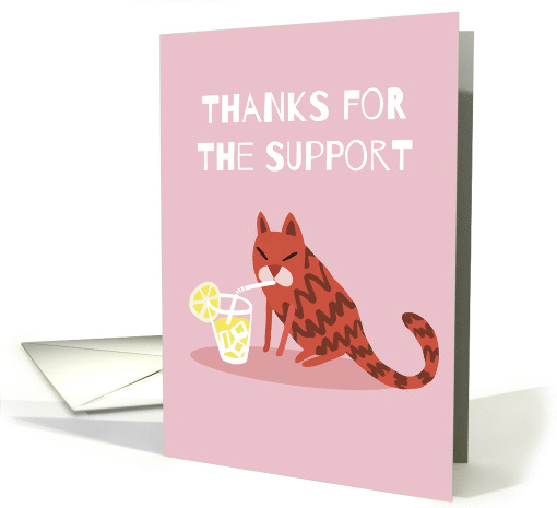 A red cat is drinking lemonade through a straw from a glass with ice cubes and a lemon slice. Text above says Thanks For The Support, and inside message says When Life Gave Me Lemons. Cute card in cartoon style and bright colors of red, yellow, and pink.
