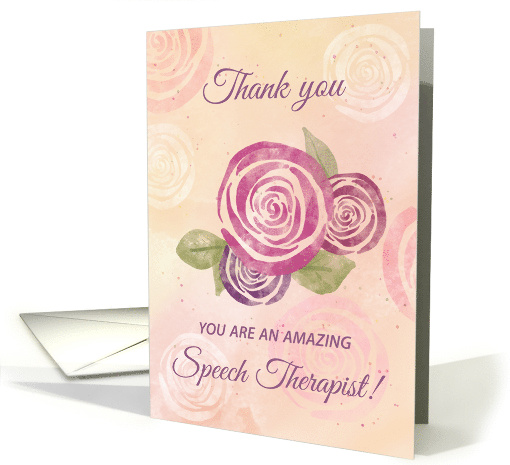 Beautiful card to thank your speech therapist for the help. Watercolor roses have a modern look. Soft roses also seen subtly are in the background. Purple, magenta, and wine colors are set off by the green leaves. Very nice card for man or woman speech therapist.