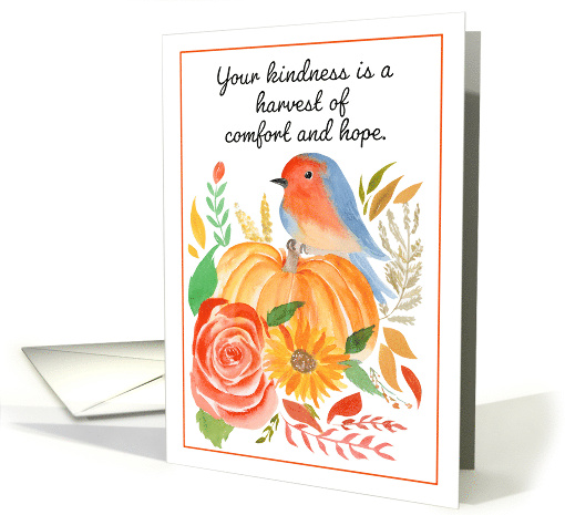 Send heartfelt thanks with this charming watercolor card featuring a bluebird perched on a pumpkin, surrounded by vibrant autumn blooms like sunflowers, roses, and colorful fall foliage. Perfect as a thank-you or appreciation card, this design captures the beauty of the season and is ideal for expressing gratitude to someone special. Makes a thoughtful seasonal greeting for teachers, friends, coworkers, or loved ones who have gone above and beyond.