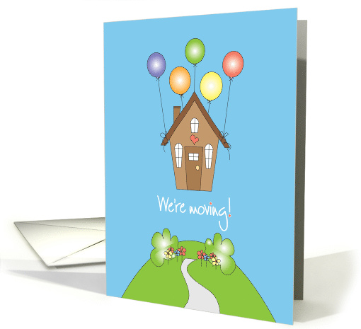 This cute announcement is for someone who is planning to move soon and wants to share with their friends and family what their new address will soon be. A darling little house is shown being lifted off by a cluster of five colorful balloons, above the hand lettered wording "We're moving". The inside has area for you to insert what your new address will be and any other details of the move that you want to share.