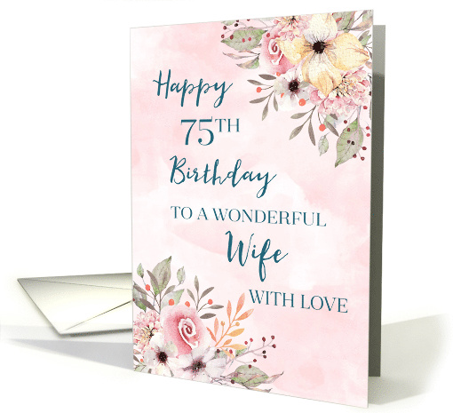 A gorgeous 75th birthday card for your amazing wife with love, with pretty pink watercolor background and country flowers.